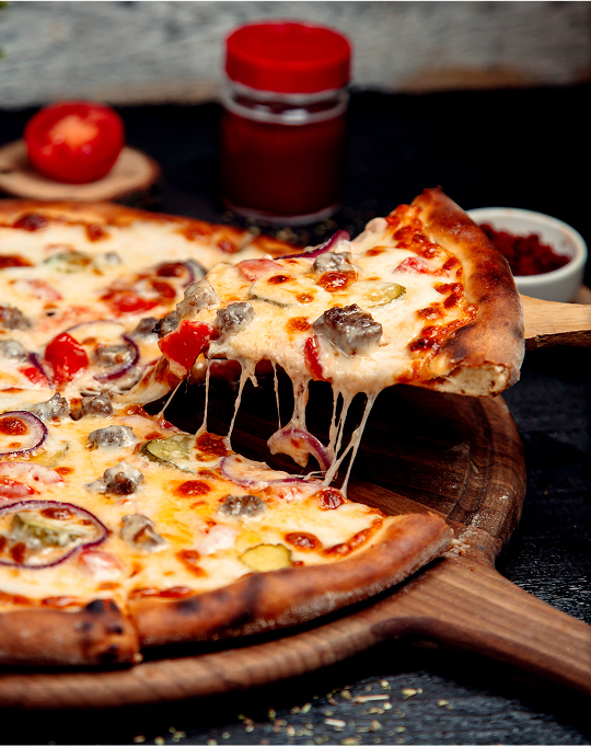 Mozzarella, cheddar, gorgonzola y parmesano sobre base de tomate.